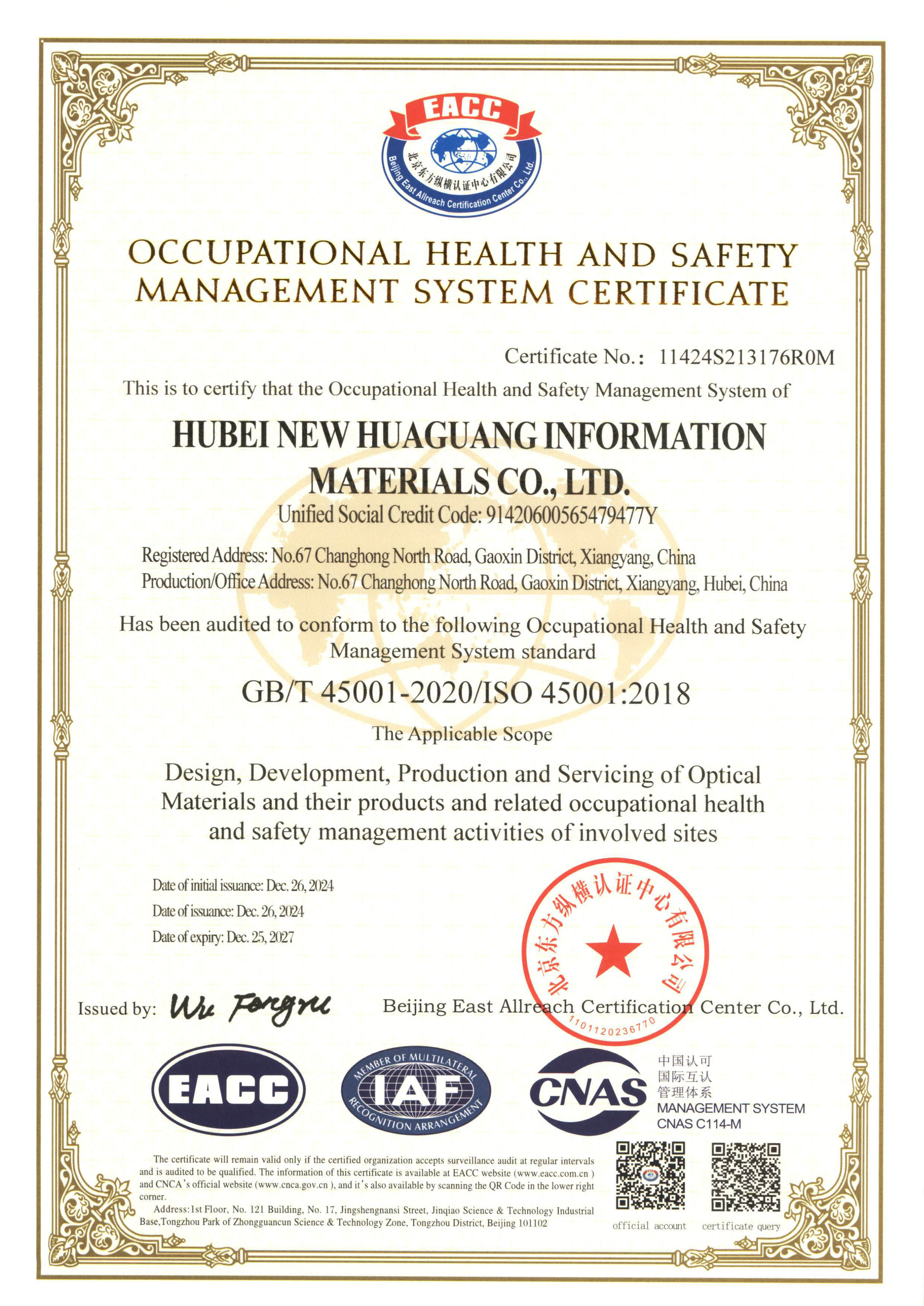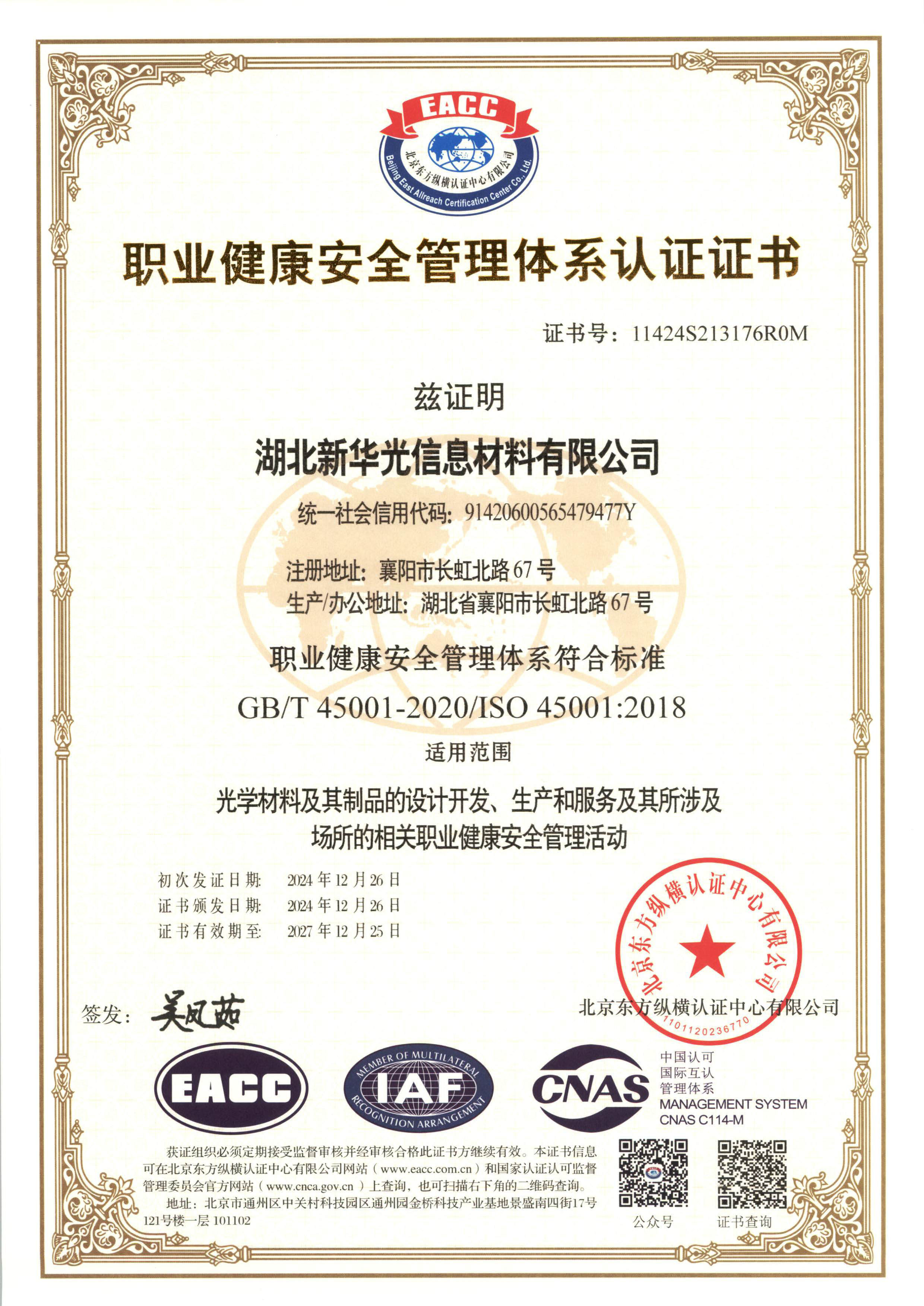 2024年通過(guò)GB/T 45001-2020(idt ISO 45001:2018)職業(yè)健康安全管理體系標(biāo)準(zhǔn)再認(rèn)證。